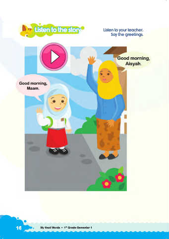 en t Listen to the storyen to the story List y or o the st Listen to the story Listen to your teacher. List Say the greetings. Good morning, Aisyah. Good morning, Maam. 16 16 unit 1. good morning cici Grade-Semester 1 xt W My Ne or ds • 1 st