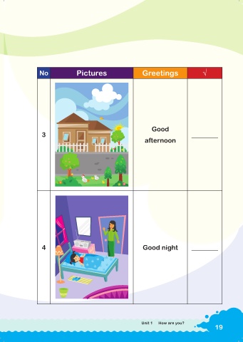 No Pictures Greetings √ Good 3 ________ afternoon 4 Good night ________ 19 Unit 1 How are you? my next words • 1 grade-semester 1 19 st