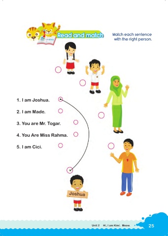 ead and mat Read and match ead and mat ch ch R R R ead and mat ch Match each sentence with the right person. 1. I am Joshua. 2. I am Made. 3. You are Mr. Togar. 4. You Are Miss Rahma. 5. I am Cici. Joshua Joshua 25 Unit 2 Hi, I am Kimi. Meow. 25