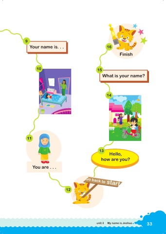 9 Your name is. . . 16 Finish 10 15 What is your name? 14 11 13 Hello, how are you? You are . . . 12 Go back to start 33 my next words • 1 grade-semester 1 33 unit 3 My name is Joshua st