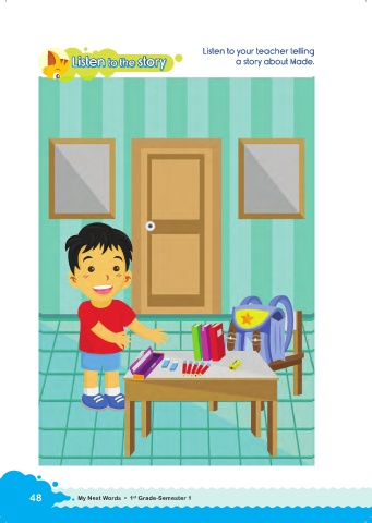 Listen to your teacher telling st en y or en List Listen to theto the story story a story about Made. Listen to the story List t o the 48 My Next Words • 1 Grade-Semester 1 st