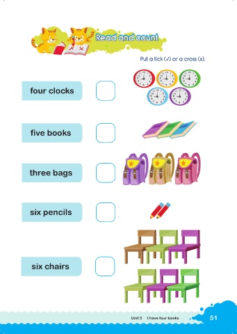 Read and count ead and count R Read and count R ead and count Put a tick (√) or a cross (x). four clocks five books three bags six pencils six chairs Unit 5 I have four books 51