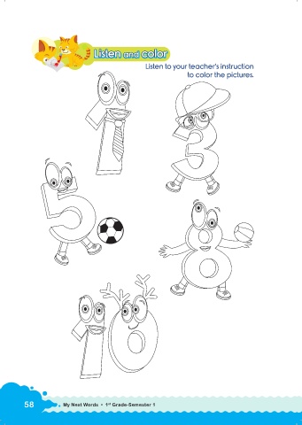 Listen and color en color Listen and color List en and color List and Listen to your teacher’s instruction to color the pictures. 58 My Next Words • 1 Grade-Semester 1 st