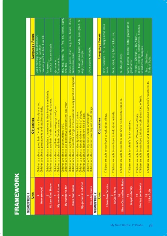FRAMEWORK SEMESTER 1 Unit 1 How are you? 2 Hi, I am Kimi. Meow. 3 My name is Joshua 4 My number is ten 5 I have four books 6 My garden is colorful 7 It is a big circle SEMESTER 2 Unit 8 I have two Pencils 9 At Cici’s farm 10 She is Cici and he is Made 11 Aisyah’s family 12 She has some fruits 13 I Like fruits