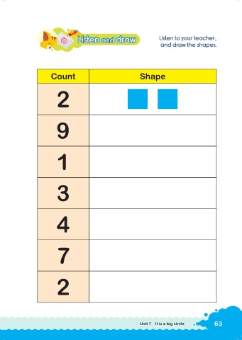 Listen and draw List en and dr aw Listen to your teacher, List en Listen and draw draw and and draw the shapes. Count Shape 2 9 1 3 4 7 2 Unit 7 It is a big circle 63