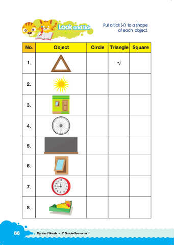 look L ook and tick Put a tick (√) to a shape and tick Look and tick look and tick of each object. No. Object Circle Triangle Square 1. √ 2. 3. 4. 5. 6. 7. 8. 66 My Next Words • 1 Grade-Semester 1 st