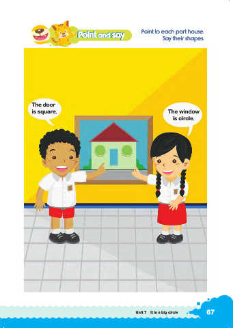 P Point and say Point and say say oint P oint and say Point to each part house. and Say their shapes. The door t is square. t The window is circle. Unit 7 It is a big circle 67