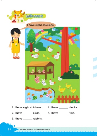 L Let’s count L et’s count et’s count Let’s count 2 3 1 I have eight chickens. 1. I have eight chickens. 4. I have _______ ducks. 2. I have _______ birds. 5. I have _______ fish. 3. I have _______ rabbits. 82 My Next Words • 1 Grade-Semester 2 st