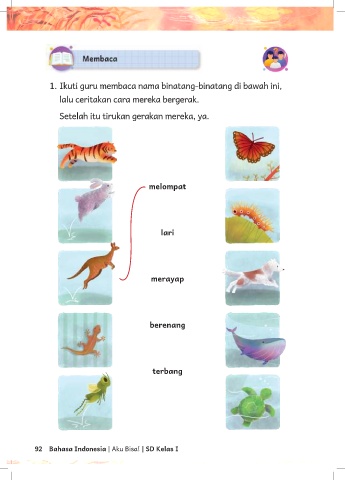 1. Ikuti guru membaca nama binatang-binatang di bawah ini, lalu ceritakan cara mereka bergerak. Setelah itu tirukan gerakan mereka, ya. melompat lari merayap berenang terbang 92 Bahasa Indonesia | Aku Bisa! | SD Kelas I