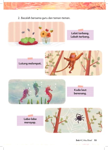 2. Bacalah bersama guru dan teman-teman. Lalat terbang. Lebah terbang. Lutung melompat. Kuda laut berenang. Laba-laba merayap. Bab 4 | Aku Bisa! 93