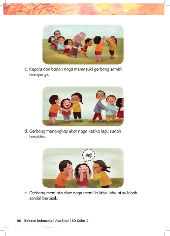 c. Kepala dan badan naga memasuki gerbang sambil bernyanyi. d. Gerbang menangkap ekor naga ketika lagu sudah berakhir. e. Gerbang meminta ekor naga memilih laba-laba atau lebah sambil berbisik. 98 Bahasa Indonesia | Aku Bisa! | SD Kelas I
