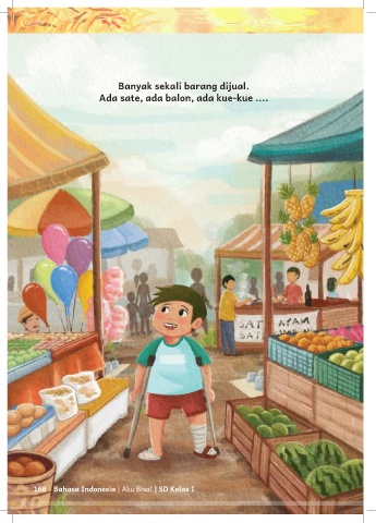 Banyak sekali barang dijual. Ada sate, ada balon, ada kue-kue .... 166 Bahasa Indonesia | Aku Bisa! | SD Kelas I