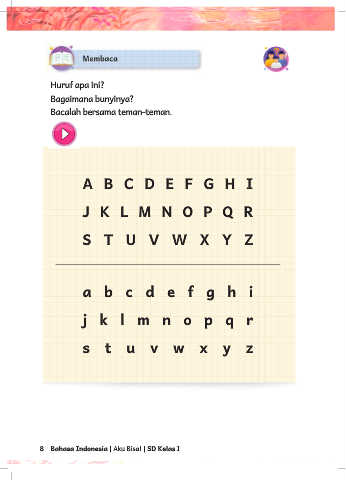 Huruf apa ini? Bagaimana bunyinya? Bacalah bersama teman-teman. A B C D E F G H I J K L M N O P Q R S T U V W X Y Z a b c d e f g h i j k l m n o p q r s t u v w x y z 8 Bahasa Indonesia | Aku Bisa! | SD Kelas I