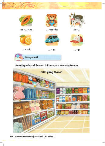 pe - ... - ya ... - ne - ka sa - ... ... - ruk ... - bil ... - pi Amati gambar di bawah ini bersama seorang teman. Pilih yang Mana? 176 Bahasa Indonesia | Aku Bisa! | SD Kelas I