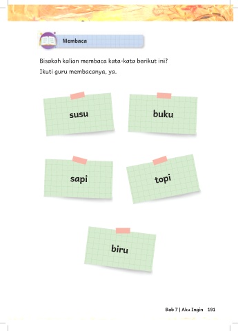 Bisakah kalian membaca kata-kata berikut ini? Ikuti guru membacanya, ya. susu buku sapi topi biru Bab 7 | Aku Ingin 191