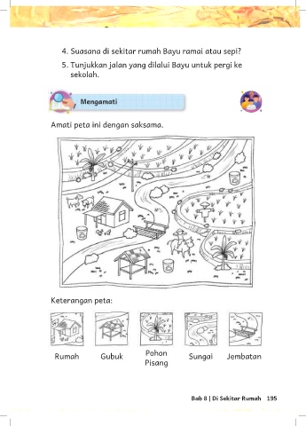 4. Suasana di sekitar rumah Bayu ramai atau sepi? 5. Tunjukkan jalan yang dilalui Bayu untuk pergi ke sekolah. Amati peta ini dengan saksama. Keterangan peta: Rumah Gubuk Pohon Sungai Jembatan Pisang Bab 8 | Di Sekitar Rumah 195
