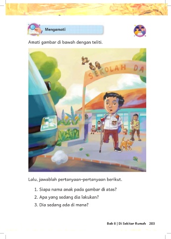 Amati gambar di bawah dengan teliti. Lalu, jawablah pertanyaan-pertanyaan berikut. 1. Siapa nama anak pada gambar di atas? 2. Apa yang sedang dia lakukan? 3. Dia sedang ada di mana? Bab 8 | Di Sekitar Rumah 203