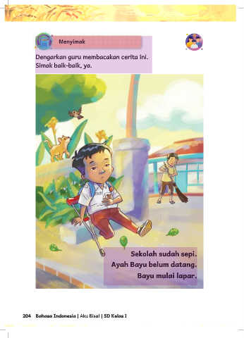 Dengarkan guru membacakan cerita ini. Simak baik-baik, ya. Sekolah sudah sepi. Ayah Bayu belum datang. Bayu mulai lapar. 204 Bahasa Indonesia | Aku Bisa! | SD Kelas I