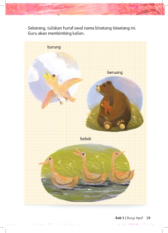 Sekarang, tuliskan huruf awal nama binatang-binatang ini. Guru akan membimbing kalian. burung beruang bebek Bab 1 | Bunyi Apa? 19