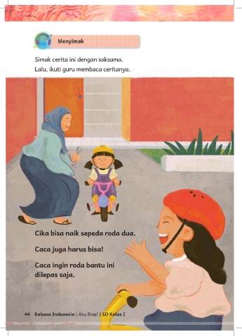 Simak cerita ini dengan saksama. Lalu, ikuti guru membaca ceritanya. Cika bisa naik sepeda roda dua. Caca juga harus bisa! Caca ingin roda bantu ini dilepas saja. 44 Bahasa Indonesia | Aku Bisa! | SD Kelas I