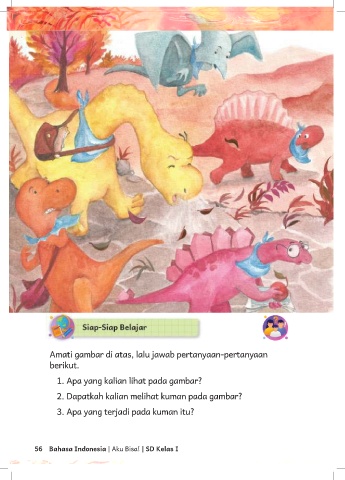 Amati gambar di atas, lalu jawab pertanyaan-pertanyaan berikut. 1. Apa yang kalian lihat pada gambar? 2. Dapatkah kalian melihat kuman pada gambar? 3. Apa yang terjadi pada kuman itu? 56 Bahasa Indonesia | Aku Bisa! | SD Kelas I