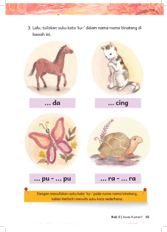3. Lalu, tuliskan suku kata ‘ku-’ dalam nama-nama binatang di bawah ini. ... da ... cing ... pu - ... pu ... ra - ... ra Dengan menuliskan suku kata ‘ku-’ pada nama-nama binatang, kalian berlatih menulis suku kata sederhana. Bab 3 | Awas Kuman! 65