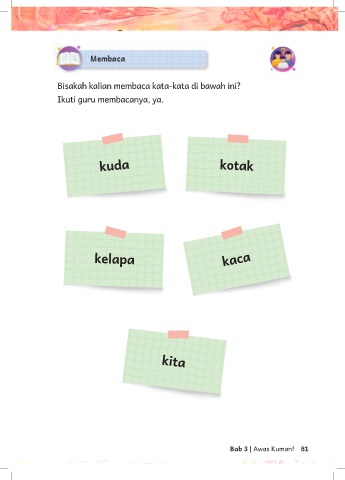 Bisakah kalian membaca kata-kata di bawah ini? Ikuti guru membacanya, ya. kuda kotak kelapa kaca kita Bab 3 | Awas Kuman! 81