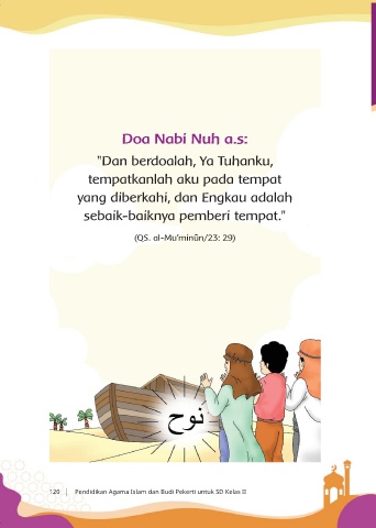 Doa Nabi Nuh a.s: "Dan berdoalah, Ya Tuhanku, tempatkanlah aku pada tempat yang diberkahi, dan Engkau adalah sebaik-baiknya pemberi tempat." (QS. al-Mu'min`n/23: 29) 120 Pendidikan Agama Islam dan Budi Pekerti untuk SD Kelas II