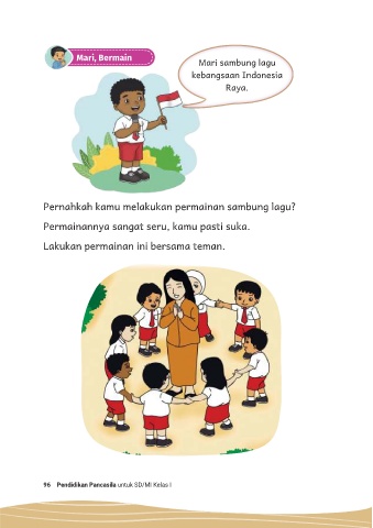 Mari, Bermain Mari sambung lagu kebangsaan Indonesia Raya. Pernahkah kamu melakukan permainan sambung lagu? Permainannya sangat seru, kamu pasti suka. Lakukan permainan ini bersama teman. 96 Pendidikan Pancasila untuk SD/MI Kelas I