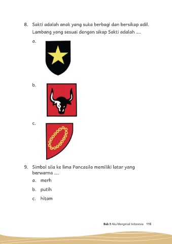 8. Sakti adalah anak yang suka berbagi dan bersikap adil. Lambang yang sesuai dengan sikap Sakti adalah …. a. b. c. 9. Simbol sila ke lima Pancasila memiliki latar yang berwarna …. a. merh b. putih c. hitam Bab 3 Aku Mengenal Indonesia 115