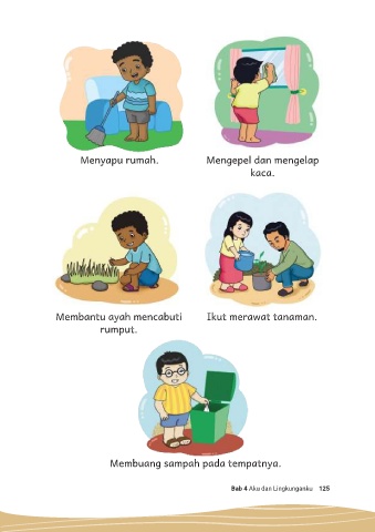 Menyapu rumah. Mengepel dan mengelap kaca. Membantu ayah mencabuti Ikut merawat tanaman. rumput. Membuang sampah pada tempatnya. Bab 4 Aku dan Lingkunganku 125