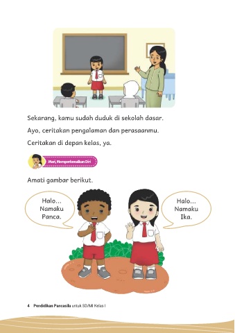 Sekarang, kamu sudah duduk di sekolah dasar. Ayo, ceritakan pengalaman dan perasaanmu. Ceritakan di depan kelas, ya. Mari, Memperkenalkan Diri Amati gambar berikut. Halo... Halo... Namaku Namaku Panca. Ika. 4 Pendidikan Pancasila untuk SD/MI Kelas I
