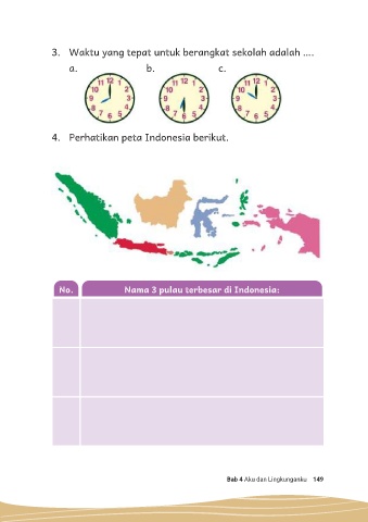 3. Waktu yang tepat untuk berangkat sekolah adalah …. a. b. c. 4. Perhatikan peta Indonesia berikut. No. Nama 3 pulau terbesar di Indonesia: Bab 4 Aku dan Lingkunganku 149