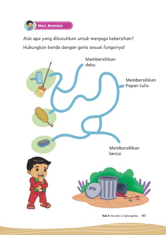 Mari, Bermain Alat apa yang dibutuhkan untuk menjaga kebersihan? Hubungkan benda dengan garis sesuai fungsinya! Membersihkan debu Membersihkan Papan tulis Membersihkan lantai Bab 4 Aku dan Lingkunganku 157