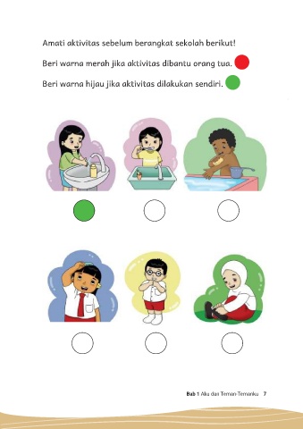 Amati aktivitas sebelum berangkat sekolah berikut! Beri warna merah jika aktivitas dibantu orang tua. Beri warna hijau jika aktivitas dilakukan sendiri. Bab 1 Aku dan Teman-Temanku 7