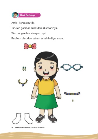 Mari, Berkarya Ambil kertas putih. Tirulah gambar anak dan aksesorinya. Warnai gambar dengan rapi. Rapikan alat dan bahan setelah digunakan. 10 Pendidikan Pancasila untuk SD/MI Kelas I