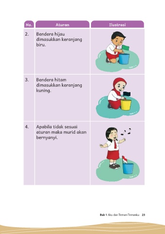 No. Aturan Ilustrasi 2. Bendera hijau dimasukkan keranjang biru. 3. Bendera hitam dimasukkan keranjang kuning. 4. Apabila tidak sesuai aturan maka murid akan bernyanyi. Bab 1 Aku dan Teman-Temanku 23