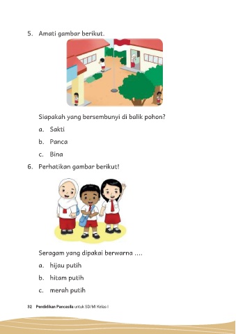 5. Amati gambar berikut. Siapakah yang bersembunyi di balik pohon? a. Sakti b. Panca c. Bina 6. Perhatikan gambar berikut! Seragam yang dipakai berwarna .... a. hijau putih b. hitam putih c. merah putih 32 Pendidikan Pancasila untuk SD/MI Kelas I