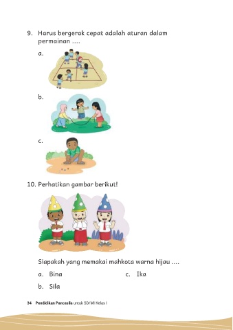 9. Harus bergerak cepat adalah aturan dalam permainan .... a. b. c. 10. Perhatikan gambar berikut! Siapakah yang memakai mahkota warna hijau .... a. Bina c. Ika b. Sila 34 Pendidikan Pancasila untuk SD/MI Kelas I