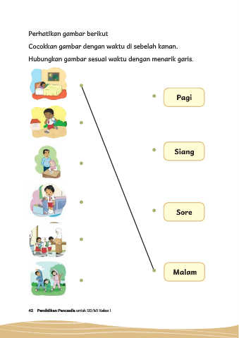 Perhatikan gambar berikut Cocokkan gambar dengan waktu di sebelah kanan. Hubungkan gambar sesuai waktu dengan menarik garis. Pagi Siang Sore Malam 42 Pendidikan Pancasila untuk SD/MI Kelas I