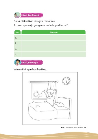 Mari, Berdiskusi Coba diskusikan dengan temanmu. Aturan apa saja yang ada pada lagu di atas? No. Aturan 1. 2. 3. 4. Mari, Berkarya Warnailah gambar berikut. Bab 2 Aku Patuh pada Aturan 45