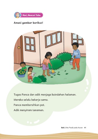 Mari, Mencari Tahu Amati gambar berikut! Tugas Panca dan adik menjaga keindahan halaman. Mereka selalu bekerja sama. Panca membersihkan pot. Adik menyiram tanaman. Bab 2 Aku Patuh pada Aturan 61