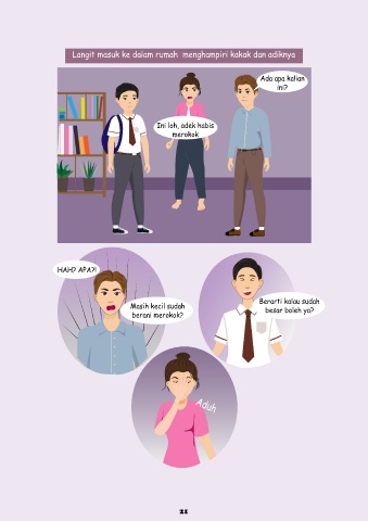 Langit masuk ke dalam rumah menghampiri kakak dan adiknya Ada apa kalian ini? Ini loh, adek habis merokok HAH? APA?! Berarti kalau sudah Masih kecil sudah besar boleh ya? berani merokok? Aduh 21