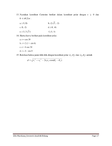 15. Buktikan bahwa jarak titik-titik dengan koordinat polar (r 1 , 1 ) dan (r 2 , 2 ) adalah