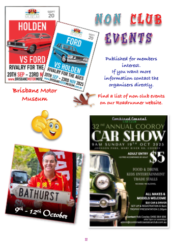 N O N C L U B E V E N T S Brisbane Motor Museum Published for members interest. If you want more information contact the organisers directly. Find a list of non club events on our Roadrunner website. 9th - 12th October 22