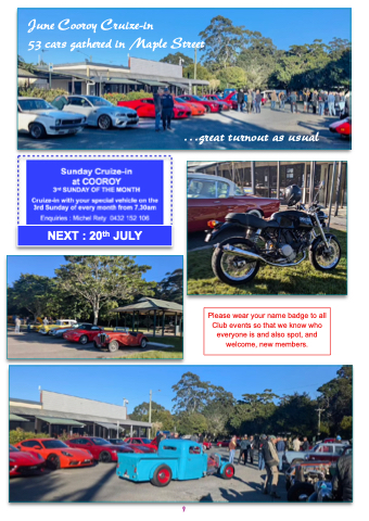 June Cooroy Cruize-in 53 cars gathered in Maple Street …great turnout as usual NEXT : 20th JULY Please wear your name badge to all Club events so that we know who everyone is and also spot, and welcome, new members. 9