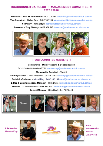 Social Co-Ordinator – Michel Rety : 0432 152 106 social@roadrunnercarclub.com.au