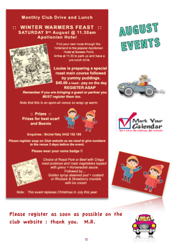 AUGUST EVENTS Please register as soon as possible on the club website : thank you. M.R. 13