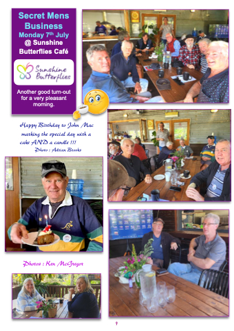 Secret Mens Business Monday 7th July @ Sunshine Butterflies Café Another good turn-out for a very pleasant morning. Happy Birthday to John Mac marking the special day with a cake AND a candle !!! Photo : Adrian Brooks Photos : Ken McGregor 9