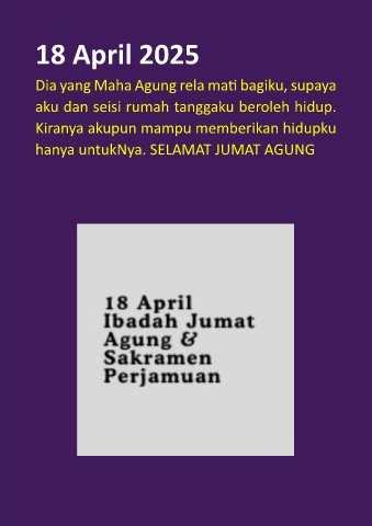18 April 2025 Dia yang Maha Agung rela mati bagiku, supaya aku dan seisi rumah tanggaku beroleh hidup. Kiranya akupun mampu memberikan hidupku hanya untukNya. SELAMAT JUMAT AGUNG
